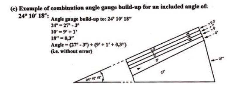 Với sự sắp xếp cụ thể này của một bộ khối đo góc gồm 15 mảnh, chúng có thể thiết lập bất kỳ góc nào đến gần nhất ±2secs of arc (2secs = 2arcseconds = 2’’= 1/1800º). (ví dụ, xem hình 1.5.3b, c). Theo một cách giống với các khối đo chuẩn thì các khối đo góc kết hợp chất lượng cao này củng được tạo ra theo các kích thước góc đã chỉ định sẵn.