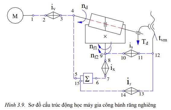 Các thành phần chuyển động cần thiết để gia công bánh răng nghiêng được mô tả trên sơ đồ (Hình 3.7). Chức năng động học của chúng như sau: